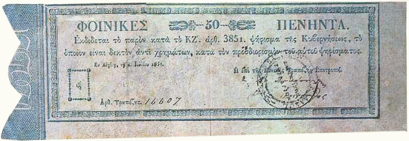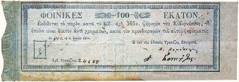 Τα πρώτα Ελληνικά χαρτονομίσματα Το πρώτο ελληνικό χαρτονομίσμα είναι οι Φοίνικες και εκδόθηκε επί κυβερνήτη Ιωάννη Καποδίστρια την 1 Ιουλίου 1831, 3 χρόνια μετά την κυκλοφορία των κερμάτων. Η εκτύπωση έγινε στην Αίγινα.
