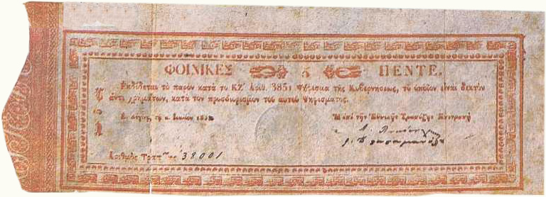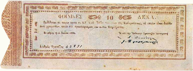 Τα πρώτα Ελληνικά χαρτονομίσματα Το πρώτο ελληνικό χαρτονομίσμα είναι οι Φοίνικες και εκδόθηκε επί κυβερνήτη Ιωάννη Καποδίστρια την 1 Ιουλίου 1831, 3 χρόνια μετά την κυκλοφορία των κερμάτων. Η εκτύπωση έγινε στην Αίγινα.