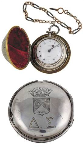 Ασημένιο ρολόι τσέπης με το οικόσημο και τα αρχικά του μονήρη και αρκετά ιδιόρρυθμου Δ. Σολωμού που είχε κατασκευάσει ο τότε ονομαστός ωρολογοποιός Edward Prior στο Λονδίνο. Αποτελείται από δυο ασημένιες θήκες και την εξωτερική θήκη ταξιδίου και ο μηχανισμός είναι υπογεγραμμένος: Edw. Prior / London και με αριθμό: 45530. Το καντράν είναι επίσης υπογεγραμμένο και με αραβικούς αριθμούς, οι ασημένιες θήκες χρονολογημένες με το γράμμα «e» [1820], η μεσαία θήκη με εγχάρακτο το οικόσημο του ποιητή και τα αρχικά του: Δ. Σ. (η χάραξη πιθανώς έγινε στα Επτάνησα), διάμετρος εσωτερικής θήκης: 5 cm., εξωτερικής: 7,5 cm.