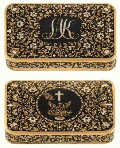 Το Νοέμβρη του 1827, ο Καποδίστριας, περιμένοντας στην Ανκόνα το αγγλικό πολεμικό που θα τον μετέφερε - κυβερνήτη πλέον, στην Ελλάδα, γράφει στον J. F. Bautte, τον καλύτερο ωρολογοποιό και κοσμηματοποιό της Γενεύης, και του ζητάει να κατασκευάσει για λογαριασμό του 6 ταμπακιέρες, 10 ανδρικά ρολόγια τσέπης και 3 ζευγάρια γυναικεία βραχιόλια, όλα χρυσά, σμαλτωμένα και με την παράσταση του αναγεννώμενου Φοίνικα και το μονόγραμμά του. Σκόπευε καθώς φαίνεται, προσφέροντάς τα σαν δώρα σε επιφανείς προσωπικότητες του τόπου, να προετοιμάσει το έδαφος για την καθιέρωση του Φοίνικα ως του επίσημου συμβόλου της Ελληνικής Πολιτείας. Στην επιστολή του προς τον Bautte σημείωνε εξάλλου ότι οι ταμπακιέρες θα έπρεπε να είναι όπως αυτή που κατασκεύασε για τον ίδιο ένα χρόνο πριν. Από την καταγραφή των αντικειμένων του Κυβερνήτη που έγινε μετά το θάνατό του, προκύπτει ότι από τα πολυτελή αντικείμενα που είχε παραγγείλει στον Bautte, είχε προλάβει να δώσει δυο ταμπακιέρες, πέντε ρολόγια και ένα ζευγάρι βραχιόλια. Σήμερα σώζονται στο Εθνικό Ιστορικό Μουσείο μια ταμπακιέρα, δυο ρολόγια (χαρισμένα στον Θ. Κολοκοτρώνη και τον Ν. Ζαβιτσάνο) και ένα ζευγάρι βραχιόλια (γαμήλιο δώρο στη Φ. Τζαβέλα), ενώ μια δεύτερη ταμπακιέρα βρίσκεται σε ιδιωτική συλλογή στην Κέρκυρα.