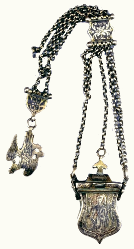 | Το μεδουλάρι μικρό δοχείο κρεμασμένο από λεπτές αλυσίδες περιείχε λιπαντικές ουσίες για τη συντήρηση των όπλων. |