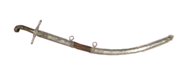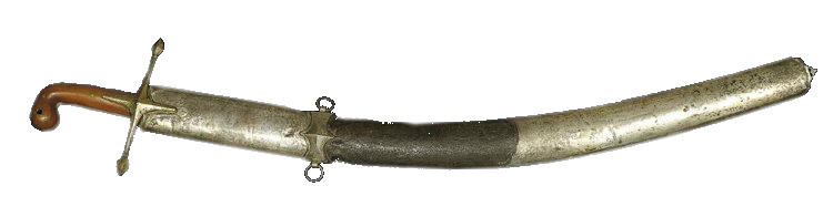 Γιαταγάνι με ασημένια λαβή και τουρκική επιγραφή του έτους 1217 Εγείρας (=1802/3), σε δερμάτινη θήκη με ασημένια εξαρτήματα, λάφυρο του πολέμου. Μήκ. 0,69 μ. Δωρεά Αγγελικής Σ. Ράλλη (ΓΕ 5937) ΜΟΥΣΕΙΟ ΕΛΛΗΝΙΚΟΥ ΠΟΛΙΤΙΣΜΟΥ |